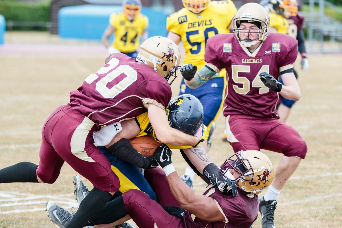 With the wind behind him, Jones was able to easily kick the ball out of the end zone for a touchback and the Cardinals would begin their next drive from their own 20 yard line. Going with the run once more, Nose Tackle Russ Groves grabbed hold of the Cardinals’ Running Back at the Line of Scrimmage and didn’t let go. Attempting to run up the middle again the Running Back was met by Linebacker Gray who, after being joined by his team mates, ripped the ball from the Cardinal players grasp. A very early whistle which favoured the Cardinals however, blew just as the ball was taken and the Cardinals kept their drive going. Again they found themselves at 3rd and 5 and again they went for the power run up the middle and again they just about managed to make the required yardage. It was attritional but effective football from the Cardinals and the frustration for the Devils Defence could be seen all across the field. Going for the run down the middle once more the Cardinals started with a small amount of yardage, before Richard Gray powered through the line to drive the Running Back backwards. The Devils Linebacker let out a roar to rally his troops after the play to which the Devils’ sideline replied with a roar of their own. When the Cardinals attempted a run to the outside, Linebacker Bowling spotted the play immediately and took down the runner for a 5 yard loss and the Cardinals were forced to punt.